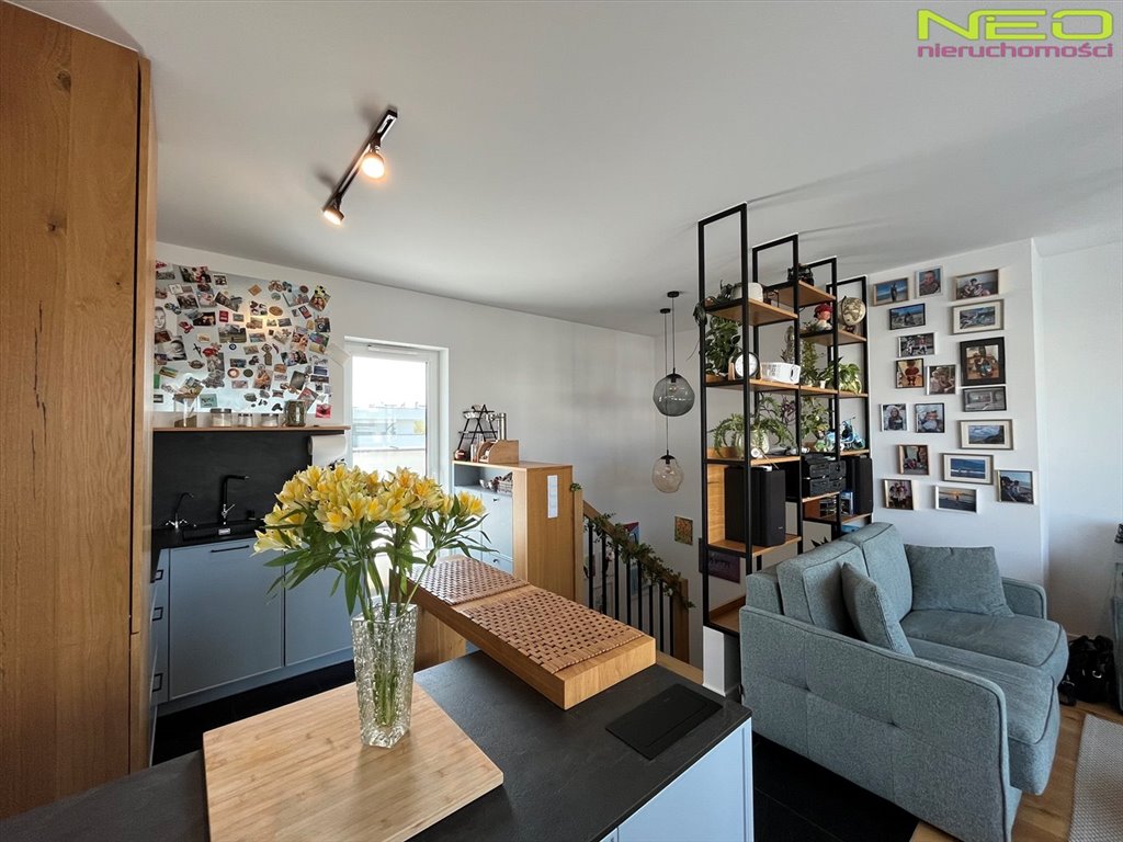 Mieszkanie jest dwupoziomowe, bardzo słoneczne i zaprojektowane tak, aby każdy metr kwadratowy był funkcjonalny.