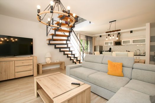 Nowoczesne wnętrze o funkcjonalnym układzie: przestronny salon z aneksem kuchennym z miejscem na przestrzeń wypoczynkową, łazienka oraz wygodny przedpokój. Wysoki standard wykończenia - gresy, nowoczesna armatura, drewniane akcenty i naturalne kolory tworzą klimat komfortu i relaksu. Na poziomie drugim znajduje się przestrzeń sypialniana z łóżkami, toaletką oraz osobną sypialnią z podwójnym łóżkiem. Dodatkowym atutem jest druga łazienka, która umili pobyt całej rodzinie i nikt nie będzie czekał w kolejce do toalety. W apartamencie jest ogrzewanie podłogowe. W pełni umeblowany i wyposażony: pralka, lodówka, płyta indukcyjna, zmywarka, telewizor, czajnik, naczynia - wszystko, czego potrzebujesz, by od razu zacząć wynajmować lub wypoczywać.