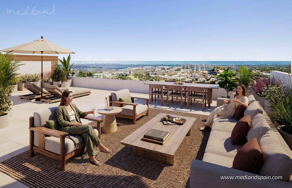 Apartments in Las Colinas Golf, Orihuela Costa, set within an established golf resort surrounded by protected Mediterranean landscape. This gated setting unfolds across a wide valley of rolling hills and natural parkland, where privacy, security, and refined living come together. Residents benefit from a full range of resort services including a championship golf course, sports and wellness facilities, dining venues, and a private owners’ club, while the exclusive beach club is reached in around 10 minutes by car.The apartments comprise layouts with 3 bedrooms, all designed to maximise light and open views across the surrounding greenery and golf. Interiors follow a contemporary Mediterranean style, combining clean architectural lines with natural materials and large windows that connect indoor and outdoor living. Ground-floor apartments include a garden area, while penthouses feature a solarium with open views towards the coast. Each home includes air conditioning, underfloor heating, fitted appliances, parking, and a storage room, ensuring comfort throughout the year.Communal areas are designed for relaxation and everyday enjoyment, with landscaped gardens that blend naturally into the environment and shared swimming pools, including one heated pool. The overall concept prioritises calm, space, and harmony with nature, creating an atmosphere where architecture and surroundings feel seamlessly integrated.The resort is located just a short drive from the beaches of Campoamor and Cabo Roig, as well as nearby towns such as San Miguel de Salinas and Villamartín, where a full range of amenities, dining spots, and leisure options are available. Alicante Airport can be reached in approximately 50 minutes and Murcia Airport in around 45 minutes, making this an accessible yet peaceful setting on the Costa Blanca.