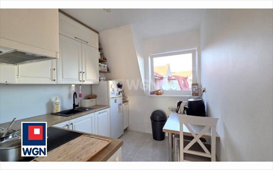 Drugi poziom mieszkania stanowi przedpokój z dużą szafą w zabudowie z drzwiami przesuwnymi, oferującą dodatkową przestrzeń do przechowywania. Oddzielna kuchnia, urządzona w stylu skandynawskim, wyróżnia się jasną kolorystyką, minimalizmem i ciepłem naturalnego drewna. Kuchnia została w pełni wyposażona w sprzęt AGD, w tym zmywarkę, piekarnik oraz płytę indukcyjną.
