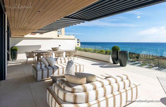 New beachfront residential complex of luxury apartments in Estepona, 600m from the Sotogrande marina. An excellent location close to the beach, with impressive sea views, as well as a variety of services and activities, like restaurants, cafés, pharmacies, supermarkets, among other comforts and conveniences. The fantastic A7 and AP7 motorways connect the area with the rest of the province, while Malaga International Airport, which is less than an hours’ drive from the complex, connects the area with the rest of the world!The complex comprises luxury apartments designed with the characteristics and distribution of a villa. Apartments available with 2, 3 and 4 bedrooms, all with spacious terraces and large windows offering magnificent sea views from all vantage points. All apartments include a Smart Home system, ducted A/C, underfloor heating in the bathrooms, LED lighting, and private garage. Depending on the model, some apartments have a small private pool on the terrace.The community area includes an indoor and an outdoor pool, a gym, a Spa and a relaxation area.