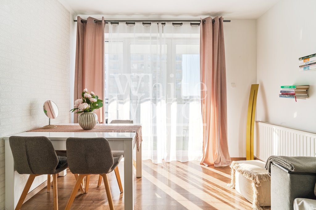 Południowa ekspozycja sprawia, że wnętrze jest doskonale doświetlone przez cały dzień, a naturalne światło podkreśla jego jasny, przytulny charakter. Układ mieszkania został zaprojektowany z myślą o funkcjonalności i komforcie codziennego użytkowania- wyraźnie wydzielono strefę dzienną oraz prywatną.