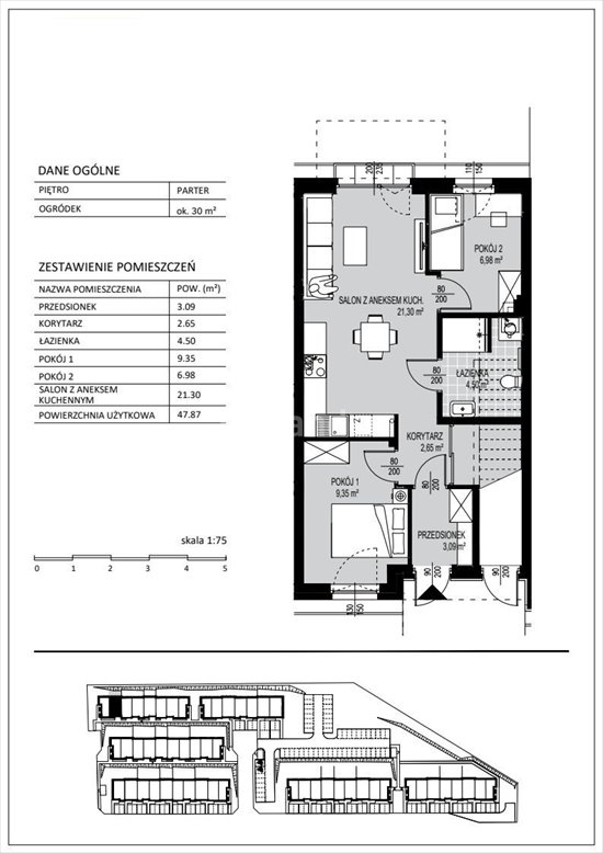 Szeregowa zabudowa, metraż od 40 do 60 m2, ogródki, balkony i miejsca parkingowe.
