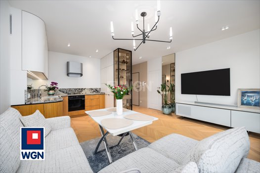 NOWOCZESNY SALON z ANEKSEM KUCHENNYM stanowi otwartą przestrzeń dzienną. Zabudowa kuchenna została wykonana według indywidualnego projektu zaakcentowana wysokiej jakości granitowym blatem oraz fornirowanymi frontami. W kuchni zastosowano designerski, a przy tym w pełni funkcjonalny okap, który świetnie wpisuje się w nowoczesny charakter wnętrza. W mieszkaniu wykorzystano wysokiej klasy oświetlenie sprowadzone z Włoch, które dodaje wnętrzu elegancji, podkreśla jego nowoczesny charakter i tworzy wyjątkowy, dopracowany klimat. Na podłodze położono drewnianą jodełkę francuską, która nadaje wnętrzu elegancji, lekkości i ponadczasowego charakteru.