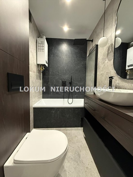 Łazienka : kabina wanna z parawanem, umywalka, podwieszone szafki, designerski grzejnik, lustro, geberit.