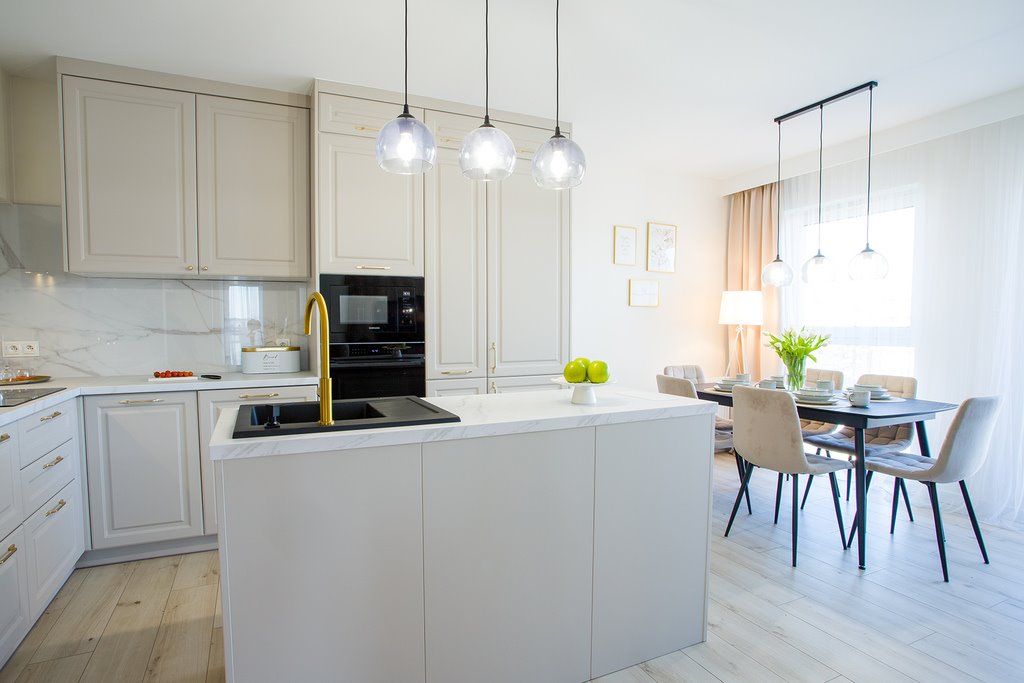 - Salon z aneksem kuchennym: Kuchnia w pełnej zabudowie, wyposażona w sprzęty wysokiej klasy (płyta indukcyjna, okap, piekarnik, mikrofala, lodówka, zamrażarka oraz zmywarka).
