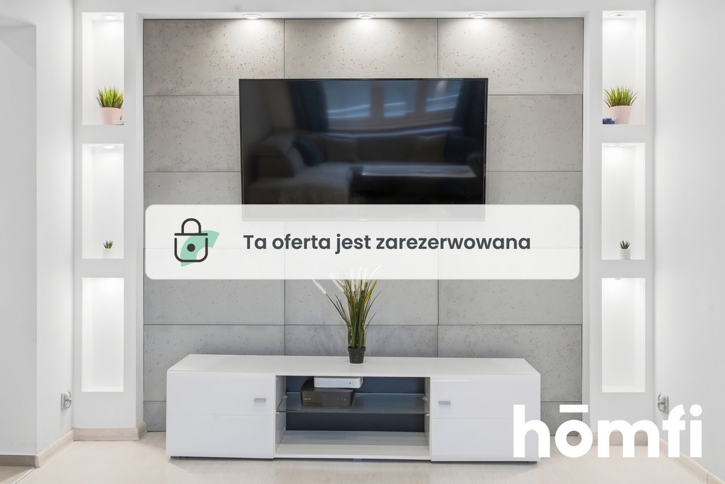 • Przestronny salon z dużymi oknami zapewniającymi świetne doświetlenie, narożna kanapa, duży telewizor i szafki RTV.