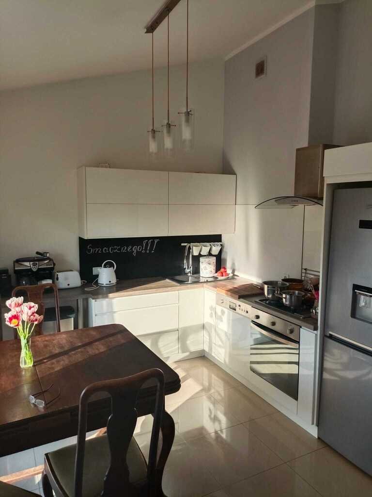 - jasny salon z aneksem kuchennym – otwarta, nowoczesna przestrzeń sprzyjająca codziennemu funkcjonowaniu i spotkaniom z rodziną lub znajomymi,