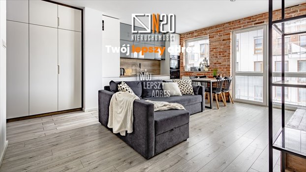 - pokój dzienny połączony z elegancką kuchnią (pełne wyposażenie: lodówka z zamrażarką, zmywarka, piekarnik, mikrofalówka, płyta indukcyjna). Charakteru nadaje akcent dekoracyjny w postaci ponadczasowej cegły, która również ociepla wnętrze;