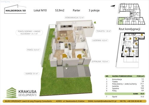 Oferowane mieszkanie oznaczone nr M10, ma powierzchnię 53,9 m2, znajduje się na parterze nowoczesnego budynku i składa się z: