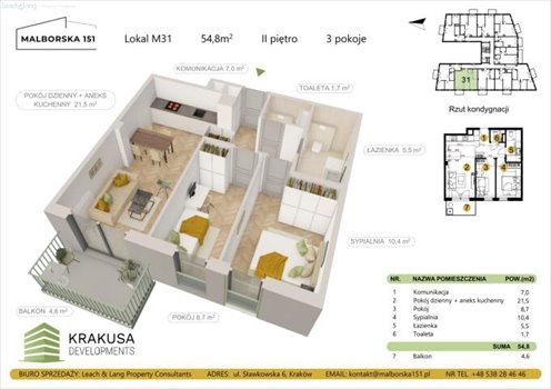 Oferowane mieszkanie oznaczone nr M31, ma powierzchnię 54,8 m2, znajduje się na drugim piętrze nowoczesnego budynku i składa się z: