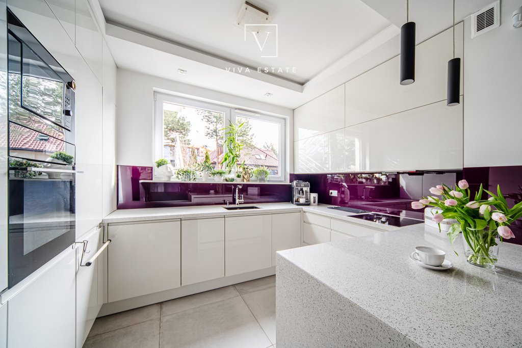 - Kuchnia połączoną z dużym salonem, w którym panoramiczne okna prowadzą bezpośrednio na urokliwy ogródek z tarasem, otoczony starodrzewem sosnowym (powierzchnia ogródka 60 mkw)