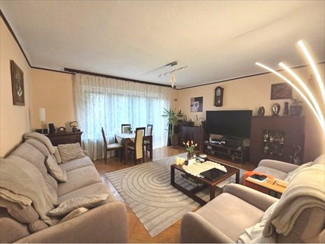 W salonie na podłodze parkiet-jodełka, na ścianach tapeta strukturalna malowana. Stolarka okienna pcv z szybami antywłamaniowymi.