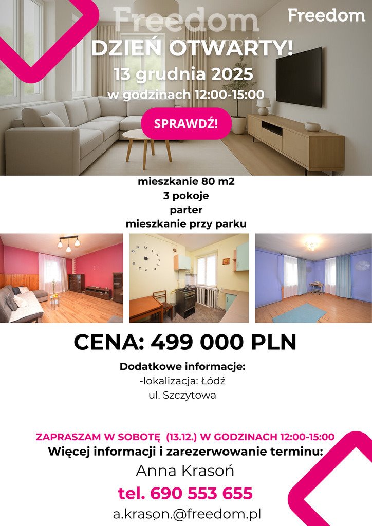 Mieszkanie trzypokojowe na sprzedaż Łódź, Szczytowa - 80,0m2
