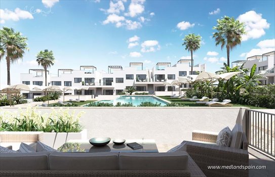 New apartment complex in Los Balcones, a residential area Torrevieja. The complex lies on the border between Torrevieja and Orihuela Costa, allowing for an extensive selection of daily amenities, like supermarkets, shops, bars and restaurants, banks, pharmacies, international schools, a medical centre, and a hospital. The area also offers a wide variety of leisure and sports activities, with four championship golf courses within a 15-minute radius, tennis and padel courts, municipal sports facilities, walking and cycling paths, and water activities at the beautiful beaches of Torrevieja and the Orihuela Costa. The area is well connected by road, allowing for easy and quick access to other tourist areas, like San Pedro del Pinatar and Murcia on the Costa Cálida, as well as Guardamar, Santa Pola, and Alicante on the Costa Blanca. The area is perfectly located between the Murcia and Alicante airports, which are 45 minutes away.The project comprises apartments with 2 bedrooms and 2 bathrooms, in a choice of models: ground floor models with a private garden, and top floor models with a private solarium. All apartments have an open plan living area, that opens onto a spacious terrace. All apartments also enjoy a panoramic view of the Torrevieja salt lakes. The apartments include pre-installation for ducted A/C, under floor heating in the bathrooms, and fitted wardrobes. Depending on the stage of construction, and for an additional price, it is possible to redesign the layout of the apartment by adding an extra bedroom.The complex is completely closed, offering a private and secure environment for residents. The central community area includes a large infinity pool with a jacuzzi, green areas, a children's playground, parking for bicycles, and a community car park, where residents can buy a parking space for an additional price.