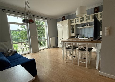 Mieszkanie jest umeblowane. Kuchnia w zabudowie, podświetlane witryny, wbudowana lodówka, zmywarka, piekarnik oraz płyta indukcyjna.