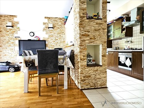 • Przestronny salon z aneksem kuchennym – naturalne podłogi z dębu dodają wnętrzu ciepła i elegancji, kuchnia wyposażona w płytę gazową, funkcjonalne szafki i sprzęty AGD.