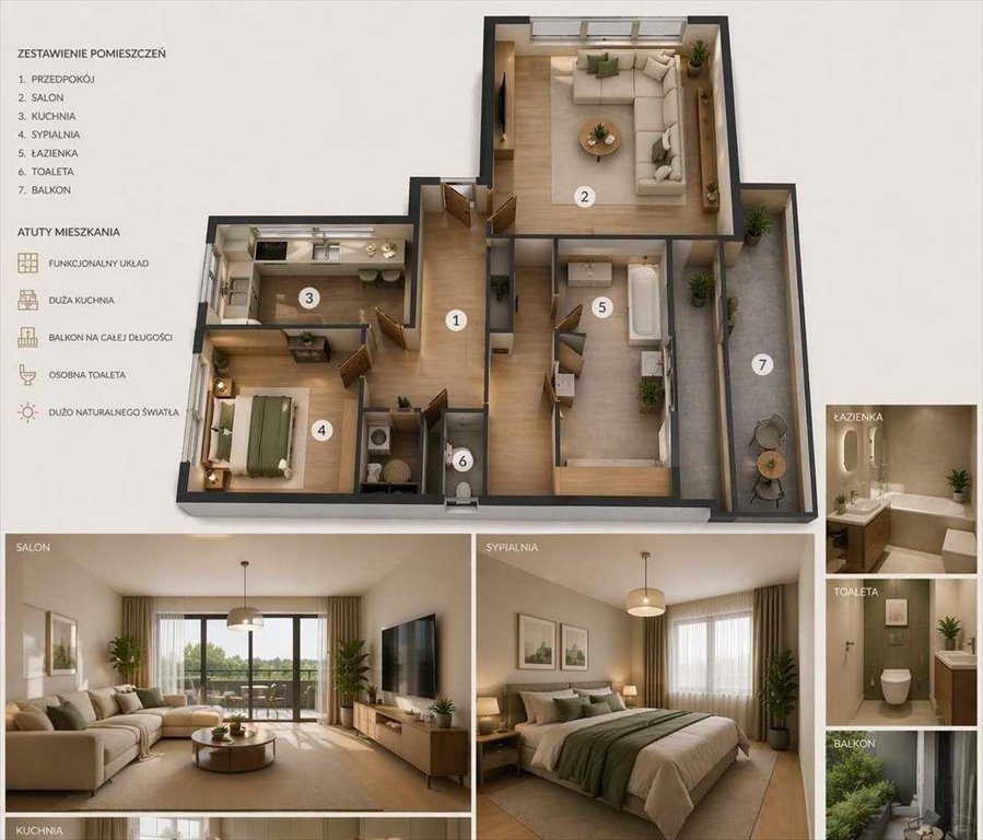 Dużym atutem nieruchomości jest czytelny, wygodny rozkład: wyraźny podział na strefę dzienną i prywatną, osobna kuchnia, salon z balkonem, a także łazienka i oddzielne WC, co znacząco podnosi komfort codziennego użytkowania.