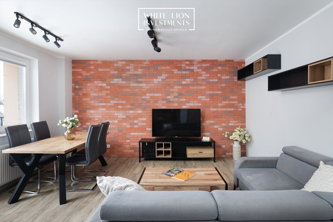 Strefa dzienna została zaprojektowana z dbałością o estetykę i funkcjonalność. Ściana wykończona cegłą stanowi mocny akcent aranżacyjny, a oświetlenie punktowe i dekoracyjne podkreśla charakter wnętrza oraz zapewnia komfort codziennego użytkowania.