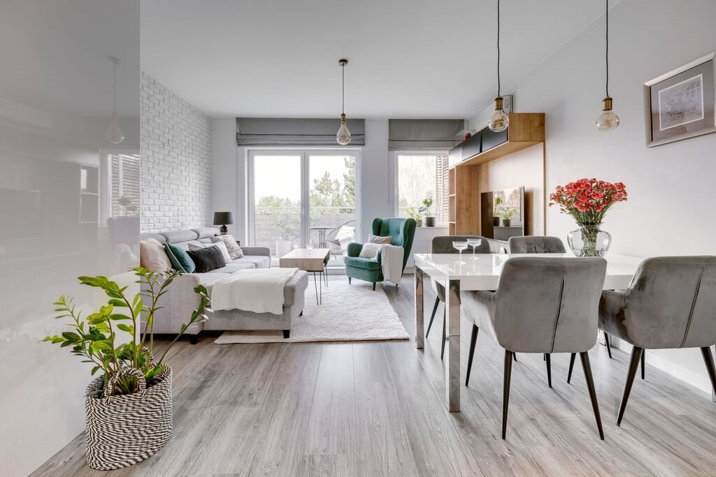 Po drugiej stronie holu mamy część dzienną - jest to przestronny salon z aneksem kuchennym (26,15 m²) . Znajdziemy tu również wystarczającą przestrzeń na dużą sofę, stolik kawowy a także stół, który zaaranżuje nam część jadalną. Z salonu bezpośrednie wyjście na balon, gdzie odpowiednio dobrane meble pozwolą Ci zamienić go w oazę spokoju na relaks w ciepłe dni.