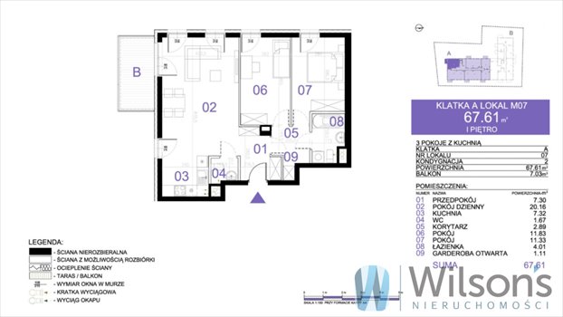 Funkcjonalny układ: salon z aneksem kuchennym (27 m²), sypialnia (11.83 m²), sypialnia (11.33) oraz łazienka (4 m²), ekspozycja płd.-zachodnia.