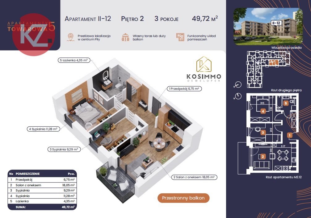Przedmiotem oferty jest mieszkanie o powierzchni 49,72 m 2 znajdujące się na II piętrze budynku. W skład mieszkania wchodzi: salon z aneksem kuchennym o pow. 18,05 m 2 , pokój o pow. 9,29 m 2 ,pokój o pow. 11,28 m 2 , łazienka o pow. 4,35 m 2 , przedpokój o pow. 6,75 m 2