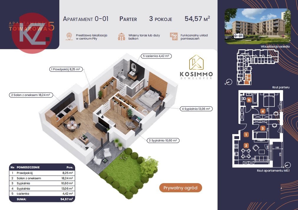Przedmiotem oferty jest mieszkanie z ogródkiem o powierzchni 54,57 m 2 znajdujące się na parterze budynku. W skład mieszkania wchodzi: salon z aneksem kuchennym o pow. 18,24 m 2 pokój o pow. 10,60 m 2 , pokój o pow. 13.06 m 2 , łazienka o pow. 4,42 m 2 , przedpokój o pow. 8,25 m 2