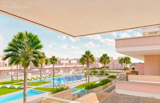 Exclusive residential complex in Pilar de la Horadada, the southernmost town of the Costa Blanca. The town offers a blend of traditional Spanish charm and modern amenities, like supermarkets, shops, bars, restaurants, and leisure activities.Outdoor enthusiasts are spoiled for choice with 4 prestigious golf courses close by, a municipal sports complex, and beautiful beaches and marinas in the coastal area of Torre de la Horadada.Travel throughout the Costa Blanca and Costa Cálida is quick and convenient, thanks to the excellent road network. Murcia airport is only 40 minutes away, with Alicante airport aprox. An hour away.Designed for luxury and comfort, the complex features homes with 3 bedrooms, spacious living areas, and large outdoor spaces, all in a sunny environment with 300+ days of sunshine a year. The homes are available in different models: Ground floor apartments with a garden, ideal for those wanting extra outdoor spaceMid-floor apartments with a terrace, ensuring a private outdoor experiencePenthouses with private solarium, perfect for enjoying the sunshine all year ‘roundTerraced villas on two floors, garden and private solarium, perfect for larger familiesThe heart of the complex encompasses a central, beautifully landscaped area with 2 large pools for adults and children, Mediterranean gardens and relaxation areas, as well as a children’s playground. There is an underground parking garage for the homes without a parking space on the premises.Designed with modern finishes and high-quality materials, the homes include pre-installation for ducted A/C, fitted wardrobes, and a parking space. Depending on the stage of construction, these homes can be customised to suit any taste from a choice of options.Experience the best of Mediterranean living in a secure environment, close to the beach, and a variety of amenities.