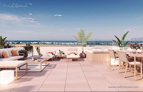 New complex of modern apartments, in a ideal location in Pilar de la Horadada, on the Costa Blanca South. Just a short walk to the town centre, with a wide selection of daily amenities, like supermarkets, shops, bars and restaurants, banks, and a medical centre. There are also many sports activities available at the municipal sports centre, like football, tennis, padel, and an impressive indoor pool. The town’s coastal area, Torre de la Horadada, also offers a variety of water sports activities, as well as a marina. There are many walking and cycling routes to the beach, which is only 15minutes away by bicycle.The complex will be built in four phases with apartments with 2 or 3 bedrooms and 2 bathrooms, available in different models: ground floor models with a private garden; mid-floor models; and top floor models with a private solarium. All apartments have an open plan lounge, dining area and kitchen, with large windows that open onto a terrace. There is also an en-suite master bedroom.The complex is closed, with an impressive community area, with a large pool for adults and children, a jacuzzi and outdoor showers. There is also a gym and various garden areas for relaxing or sunbathing. Each apartment includes a parking space and a storage unit in the underground parking garage. The complex also has parking for bicycles in the community area.