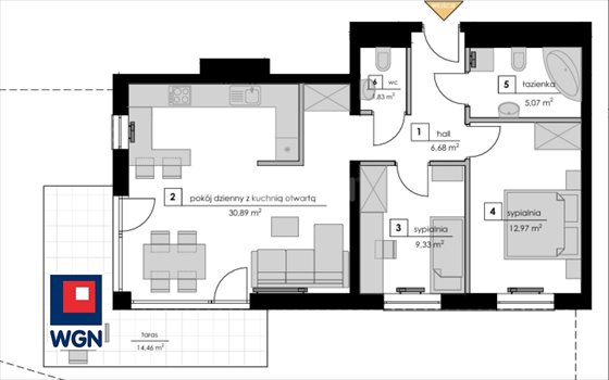 ~ 2. pokój dzienny z kuchnią: 30,89 m2;