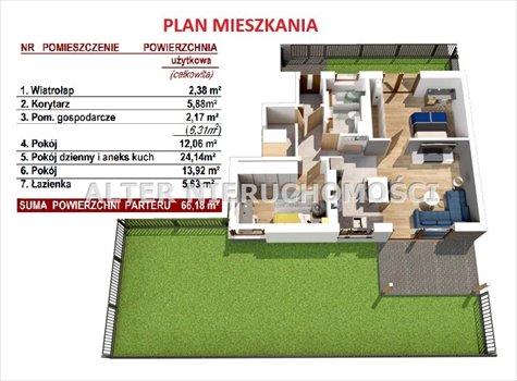 - Powierzchnia 66,18 m² na Parterze, to doskonale rozplanowane wnętrze. Znajduje się przytulne trzypokojowe mieszkanie: salon z aneksem kuchennym (24 m²), dwie niezależne sypialne (12 i 14 m²), łazienka (5,6 m²) oraz korytarz z wiatrołapem.
