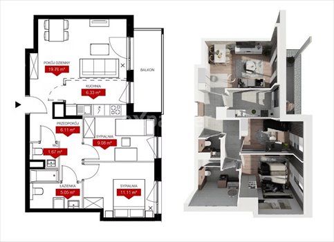 -pokój z aneksem kuchennym 26,09 m2 lub pokój dzienny 19,76 m2 i kuchnia 6,33 m2