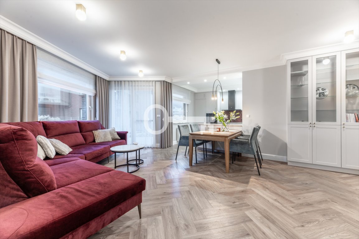 This spacious apartment combines elegance, functionality, and a unique atmosphere. The interior has been designed with attention to detail - from the warm wooden herringbone flooring, through the bright kitchen cabinets, to the designer lighting that creates a cozy atmosphere.