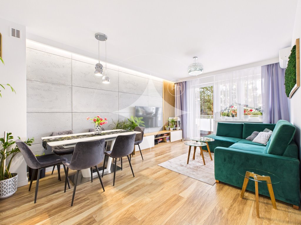 • Salon z klimatyzacją i wyjściem na spory balkon, na którym położona jest deska tarasowa – idealne miejsce na kawę albo odpoczynek po pracy