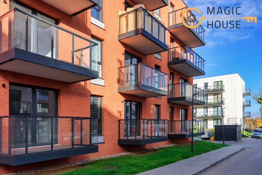 Elewacja w kolorze białym doskonale harmonizuje z naturalną okładziną ceglaną oraz otaczającą zielenią osiedla, tworząc wyjątkowy i estetyczny wygląd. Ponadto, balkony z balustradami wypełnionymi szkłem prezentują się efektownie i dodają uroku całej przestrzeni.