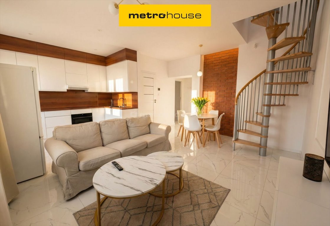 Na pierwszym poziomie znajduje się przestronny, jasny salon z otwartą kuchnią, komfortowa sypialnia oraz duża łazienka z wanną. Drugi poziom zaadaptowane poddasze oferuje duży, ustawny pokój, który może pełnić funkcję sypialni, pokoju dziecięcego lub gabinetu, a także drugą łazienkę z prysznicem. Taki układ zapewnia wygodę oraz wyraźny podział strefy dziennej i prywatnej.