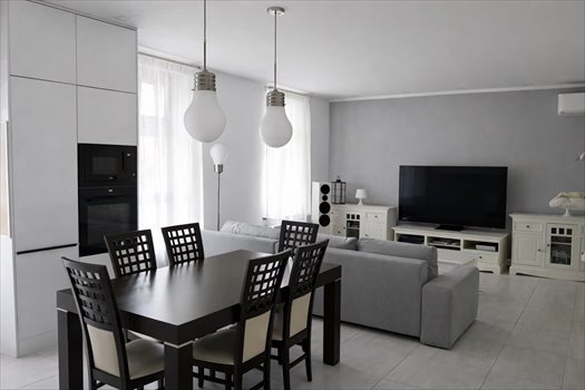 Kuchnia z salonem (41,8 m²) - przestronna, otwarta strefa dzienna z kuchnią w zabudowie (odnowioną w 2019 r.) i kompletnym sprzętem AGD: zmywarka, płyta indukcyjna, piekarnik, mikrofalówka, okap, lodówka
