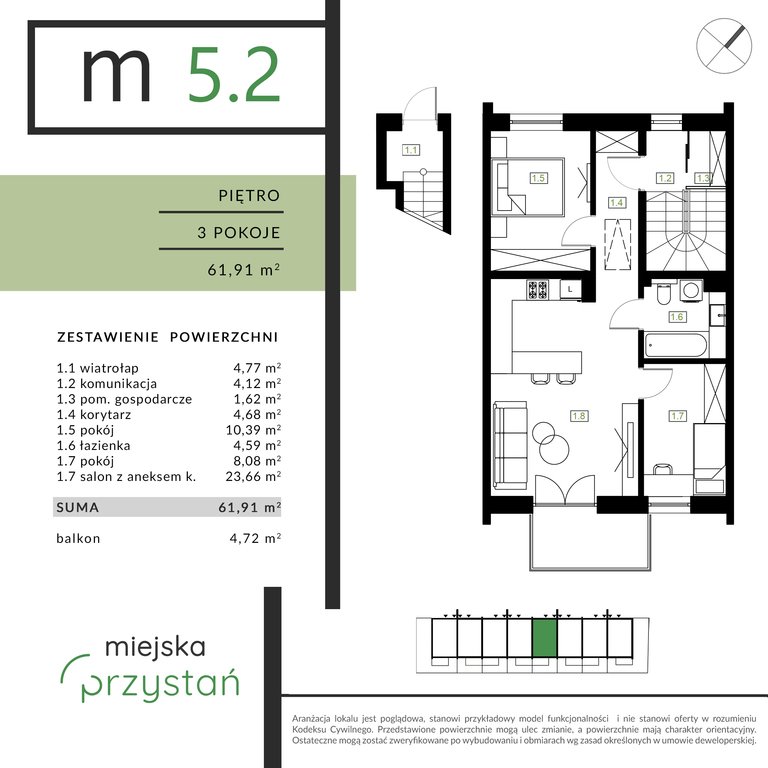 - powierzchnia: 61,91m2 oraz balkon: 4,72m2