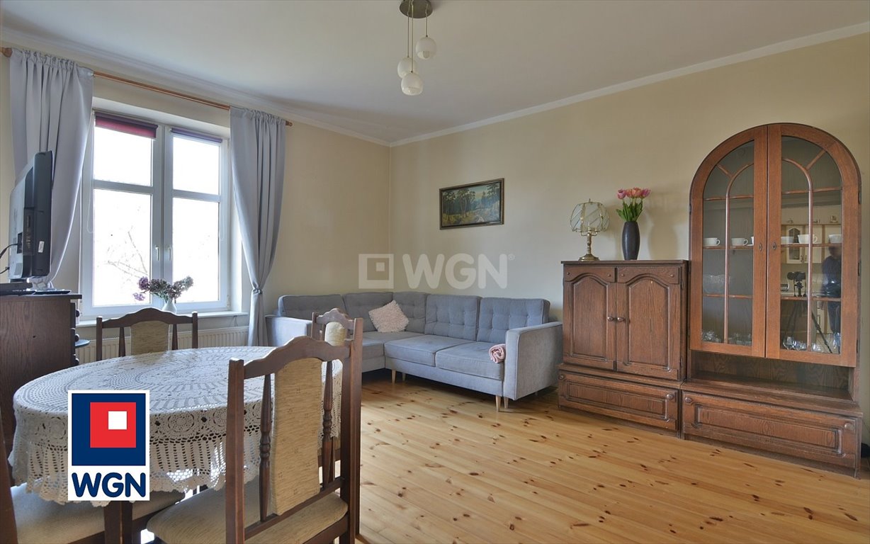 Mieszkanie w dobrym stanie o powierzchni 67 m2. Składa się z salonu i sypialni z wejściami od strony kuchni, trzeciego pokoju zaadaptowanego ze strychu z wejściem od strony przedpokoju, dużej kuchni, łazienki z WC, przedpokoju ze spiżarnią i pomieszczenia gospodarczego za trzecim pokojem. Okna PCV z ekspozycją na północ i zachód. Instalacja elektryczna miedziana poza przedpokojem. Przyszły właściciel będzie miał dostęp do Internetu i telewizji naziemnej. Mieszkanie bezczynszowe. Woda z sieci miejskiej, odprowadzanie ścieków do 4-komorowego szamba opróżnianego co miesiąc. Ogrzewanie centralne na piec etażowy, znajdujący się w kuchni, ciepła woda dodatkowo na bojler elektryczny wykorzystywany poza sezonem grzewczym, mieści się on na strychu, jednak jego włącznik znajduje się w kuchni.