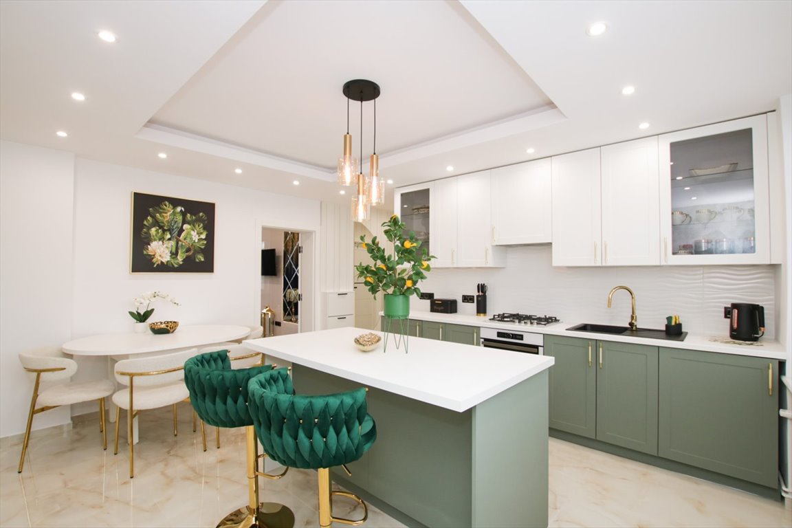 Wnętrze utrzymane jest w eleganckiej, stonowanej kolorystyce, z wykorzystaniem modnych kaszmirowych tonów, luster oraz nowoczesnego oświetlenia, co tworzy wyjątkowy klimat i podkreśla prestiż nieruchomości.