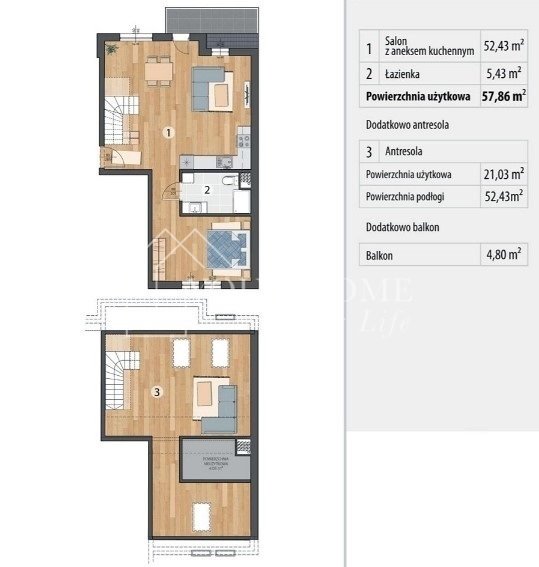 - Antresola - powierzchnia użytkowa 21,03 m², powierzchnia podłogi - 52,43 m²