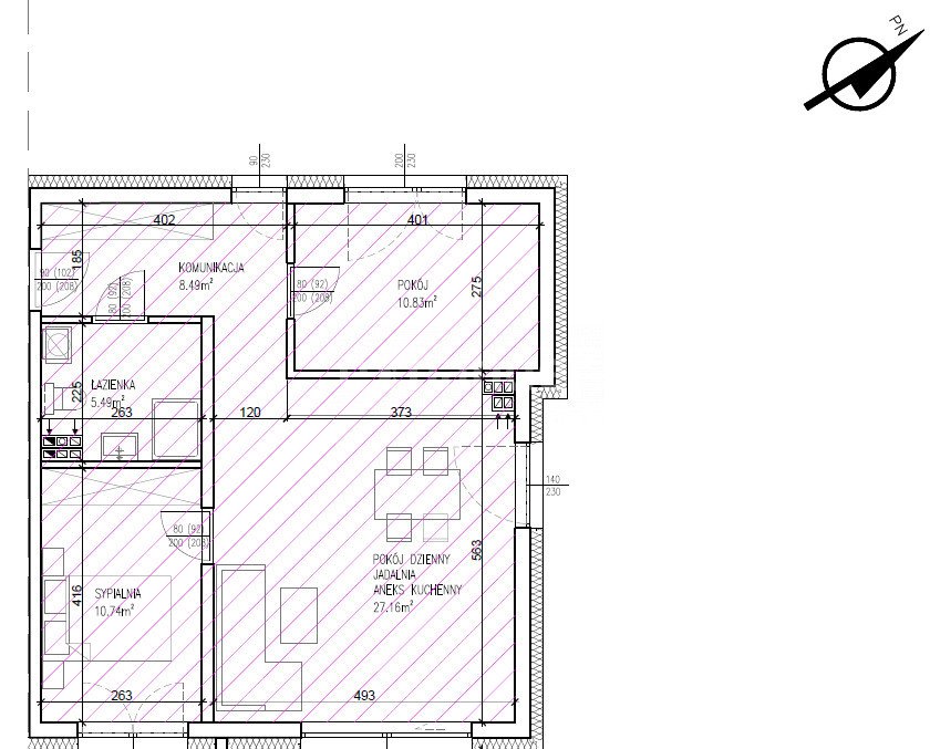 Mieszkanie w stanie deweloperskim nr F1 znajduje się na 1 piętrze, ma prawie 63m2 i składa się z: