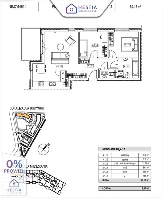 Na całkowitą powierzchnię 60,18 m 2 wchodzi :