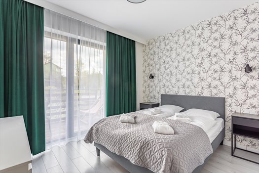 Z poziomu klatki schodowej wchodzimy do dolnej części apartamentu, w której znajdują się dwie sypialnie - jedna z dużym łóżkiem małżeńskim, druga z wygodną, rozkładaną sofą - z obu pomieszczeń można wyjść na wspólny balkon. Na tym poziomie mieści się również łazienka z prysznicem oraz przedpokój, z którego eleganckie schody prowadzą do części dziennej. Na piętrze znajduje się przestronny salon z rozkładaną kanapą, telewizorem oraz w pełni wyposażonym aneksem kuchennym. W apartamencie zadbano o każdy detal: lodówka, płyta indukcyjna, zmywarka, czajnik elektryczny, ekspres przelewowy, toster i komplet przyborów kuchennych tworzą przestrzeń gotową na przyjęcie gości. W części dziennej znajduje się również duży stół z krzesłami, przy którym wygodnie zasiądzie sześć osób, a także drugi balkon, z którego można podziwiać boczny widok na góry.