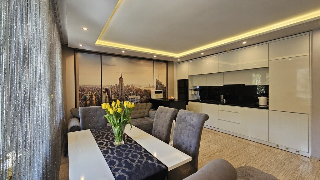 - nowoczesna zabudowa kuchenna z pełnym wyposażeniem