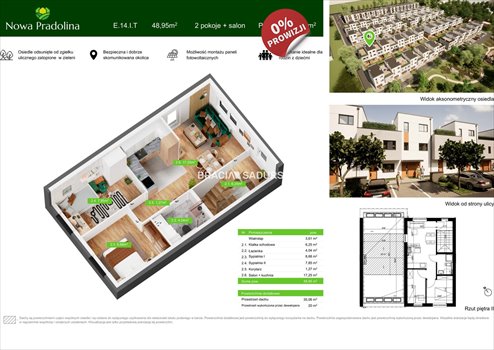 Prezentowane mieszkanie o pow. 48,95 m 2 , znajduje się na 2 piętrze w dwu piętrowej części budynku. Składa się z salonu z aneksem kuchennym pow. 17,25 m 2 , 2 sypialni o pow. 8,68 m 2 i 7,85 m 2 , łazienki ( 4,04 m 2 )i komunikacji. Mieszkanie posiada taras o pow. 60,61 m 2 .