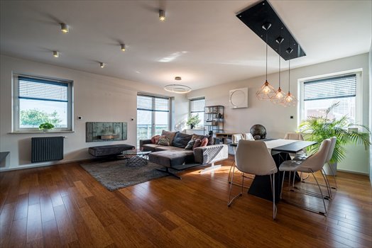 Mieszkanie składa się z: dużego salonu połączonego z jadalnią i aneksem kuchennym, dwóch sypialni z każdej wyjście na balkon, dwóch łazienek w tym jednej połączonej z sypialnią, dwóch garderób, pomieszczenia gospodarczego na poziomie tarasu, przedpokoju z wbudowanym w ścianę schowkiem, dwóch balkonów i dużego tarasu (ok. 75 m2). Część dzienna doświetlona panoramicznym oknem od strony południowej i zachodniej. Z salonu wyjście na narożny balkon z widokiem na Wisłę. Ogrzewanie miejskie. Miesięczny czynsz administracyjny to szacunkowo 1430 zł. Mieszkanie o wysokim standardzie.