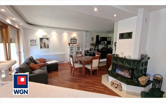 - przestronny salon z kominkiem i aneksem kuchennym (wyposażonym w sprzęt + piekarnik do pizzy, lodówka na wino),