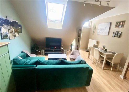 połączony z aneksem kuchennym, przedpokój. Z balkonu widać las i góry.