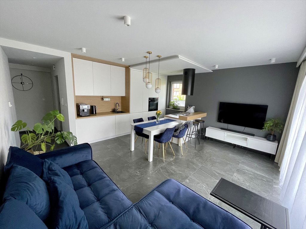 przestronny, jasny salon z nowoczesnym aneksem kuchennym, z bogatym wyposażeniem AGD, wyjście na ogród,